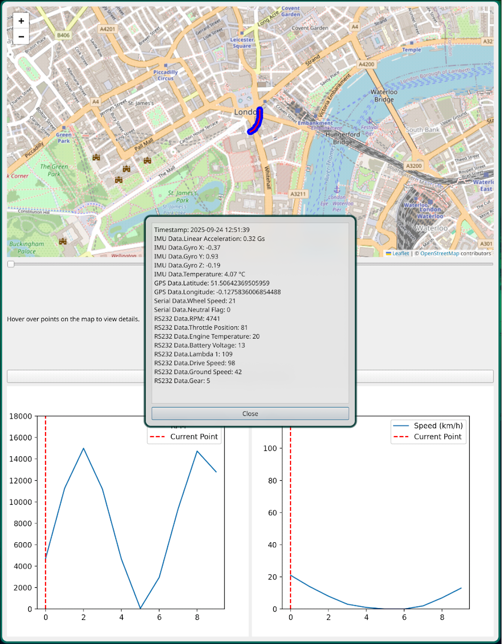- As you can see, there are two graphs displaying RPM and Speed as well as a few parameters displayed above for easy tracking. You can also press a button to view all the data in the packet or the GPS location rendered dynamically in a map window. You may also notice that there is a button to Start and Stop recording data - this ties into the other piece of software I built, the Analyzer. The client can record data to a CSV file which will then be picked up and read by another program.